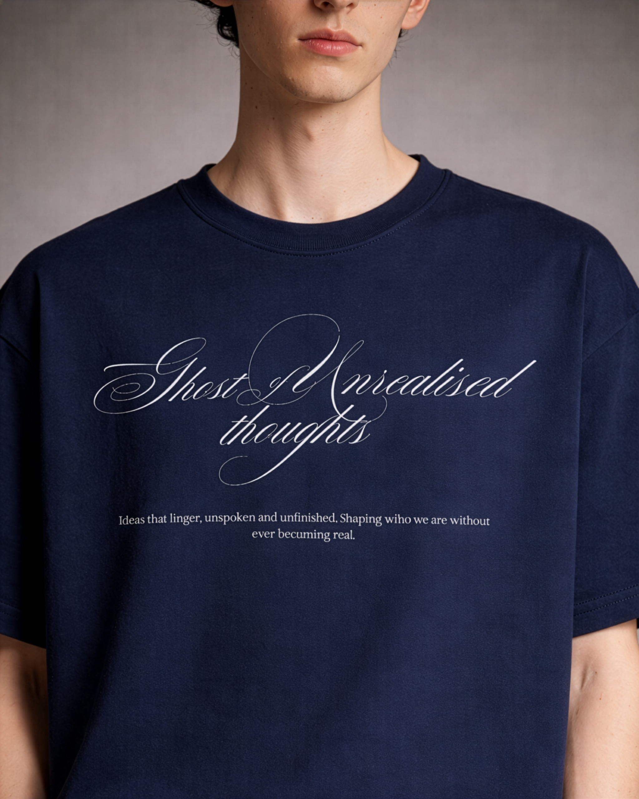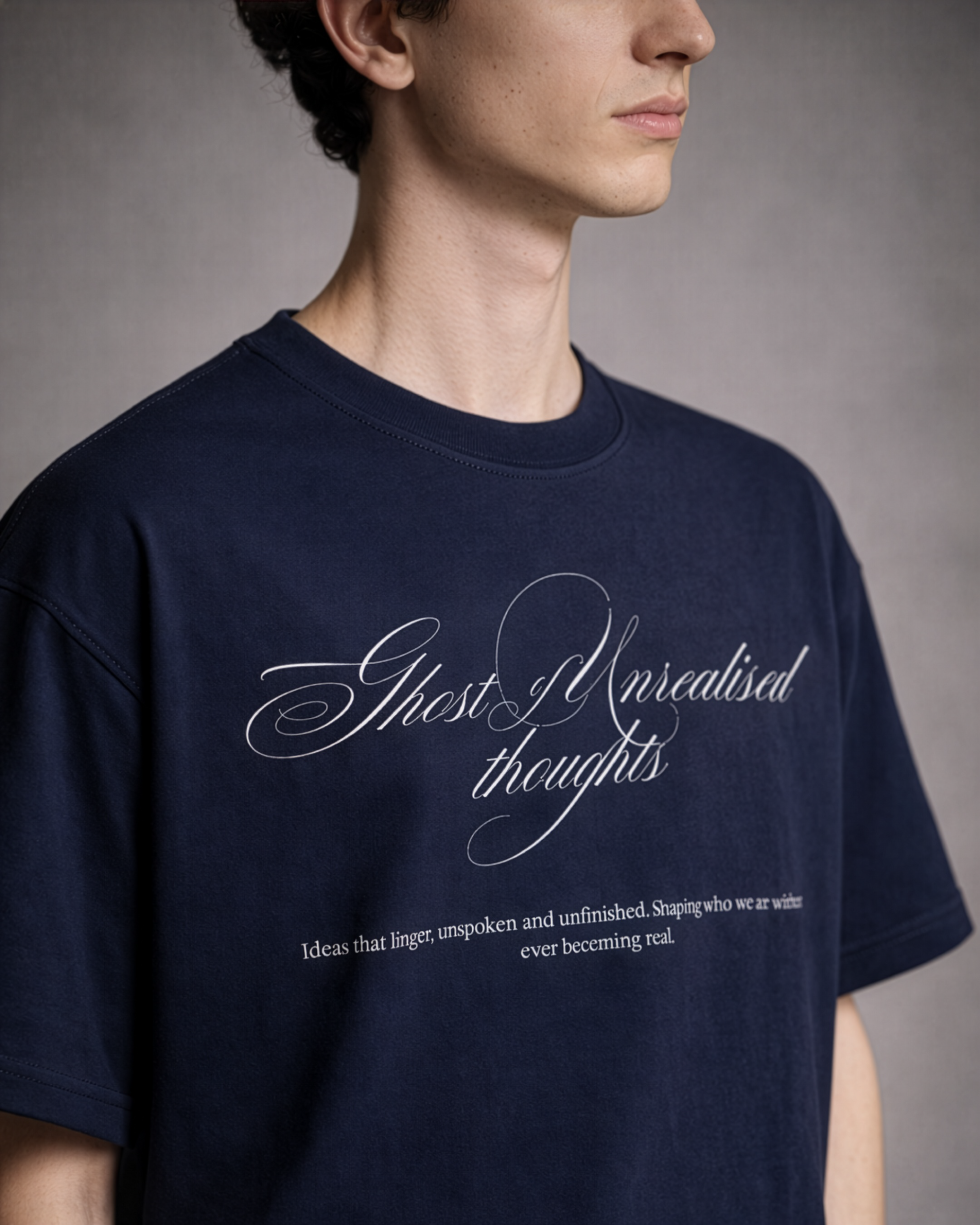 We all have versions of ourselves that never happened. This tee honors the “what ifs.” Featuring elegant, ghostly script on a deep midnight navy canvas, it’s a wearable reminder that your potential is terrifyingly infinite.