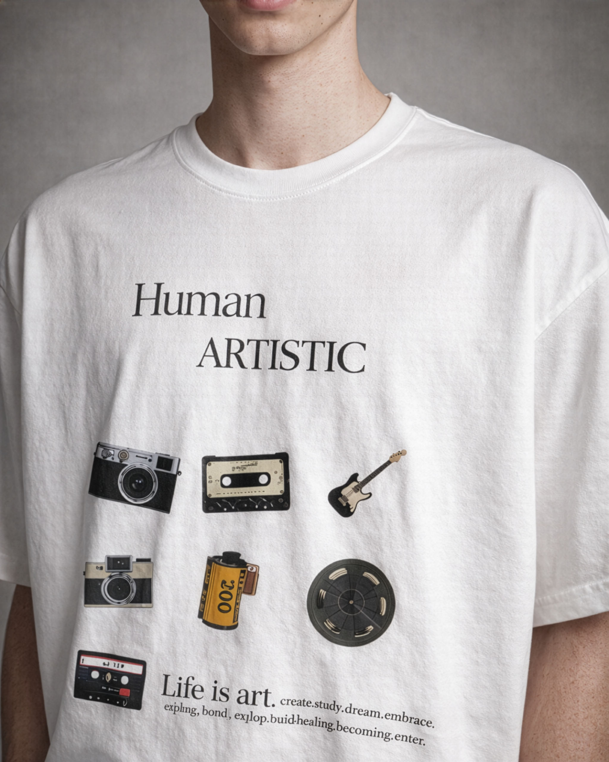 For the creators, the filmmakers, and the archivists. This tee is an ode to analog media—cassettes, film rolls, and vintage cameras. “Life is art” isn’t just a slogan; it’s a command to document your existence.